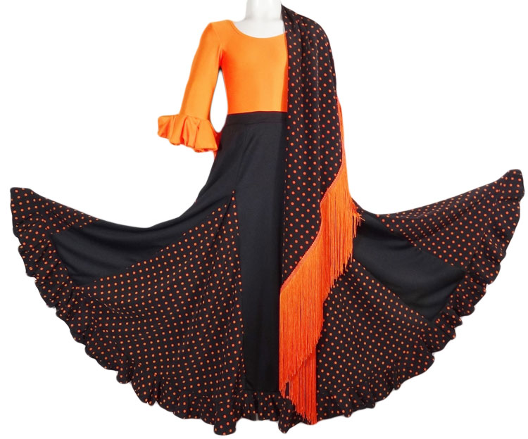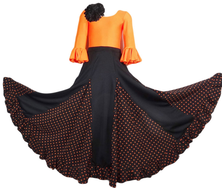FALDA NIÑA PARA EL BAILE FLAMENCO NEGRO CON LUNARES NARANJA EN PROMOCION